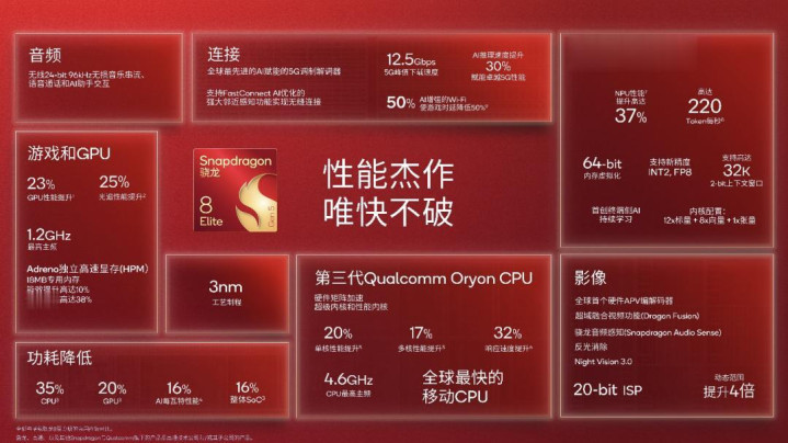 高通官方将第五代骁龙8至尊版称为“当下最快的移动SoC”。相较前代产品骁龙8至尊版,第五代骁龙8至尊版响应速度提升达32%、CPU能效提升35%、GeekBench单线程性能提升20%、GeekBench多线程性能提升17%。